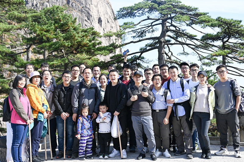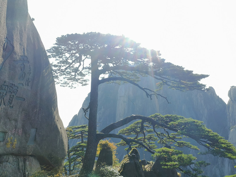 走到揚(yáng)名世界的黃山迎客松前,大家紛紛拿出手機(jī)合影。的確,迎客松已經(jīng)成為了黃山的標(biāo)志性景觀了。古來(lái)多少詩(shī)人都為之贊嘆,連導(dǎo)游都開(kāi)玩笑說(shuō):“黃山的GDP可都是由它拉動(dòng)的?!睆挠衿翗峭^(guò)去,迎客松左邊的小枝丫宛如插在褲兜里面,右邊的枝丫猶如伸出一只臂膀在歡迎遠(yuǎn)道而來(lái)的客人。