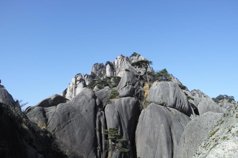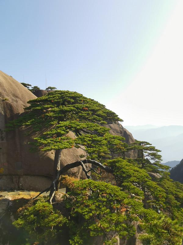 纜車在經(jīng)過(guò)一座座山峰時(shí),我看到很多的懸崖上都有造型奇特、生命力特別強(qiáng)的樹(shù),一邊光禿禿的,另一邊的枝丫卻很茂盛。我曾在書(shū)上看到過(guò)黃山的迎客松,想來(lái)這便是和迎客松屬于同一種植物吧,后來(lái)我還百度了一下,這就是黃山特有的一種樹(shù),故取名“黃山松”。